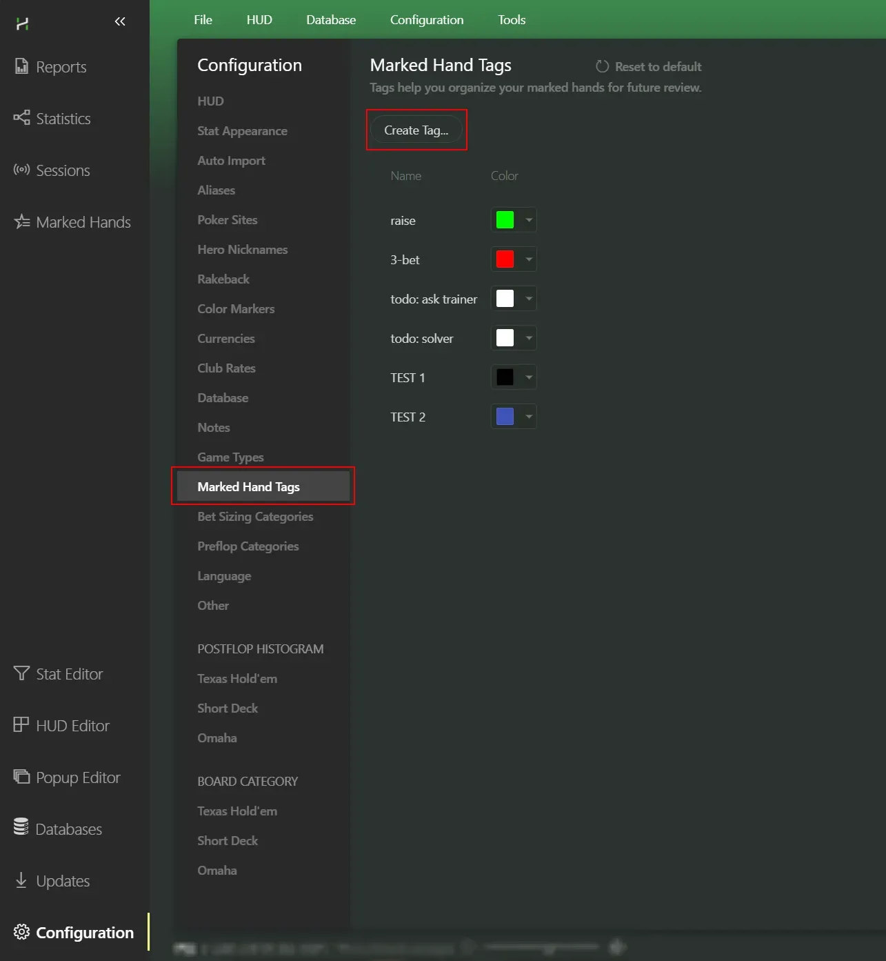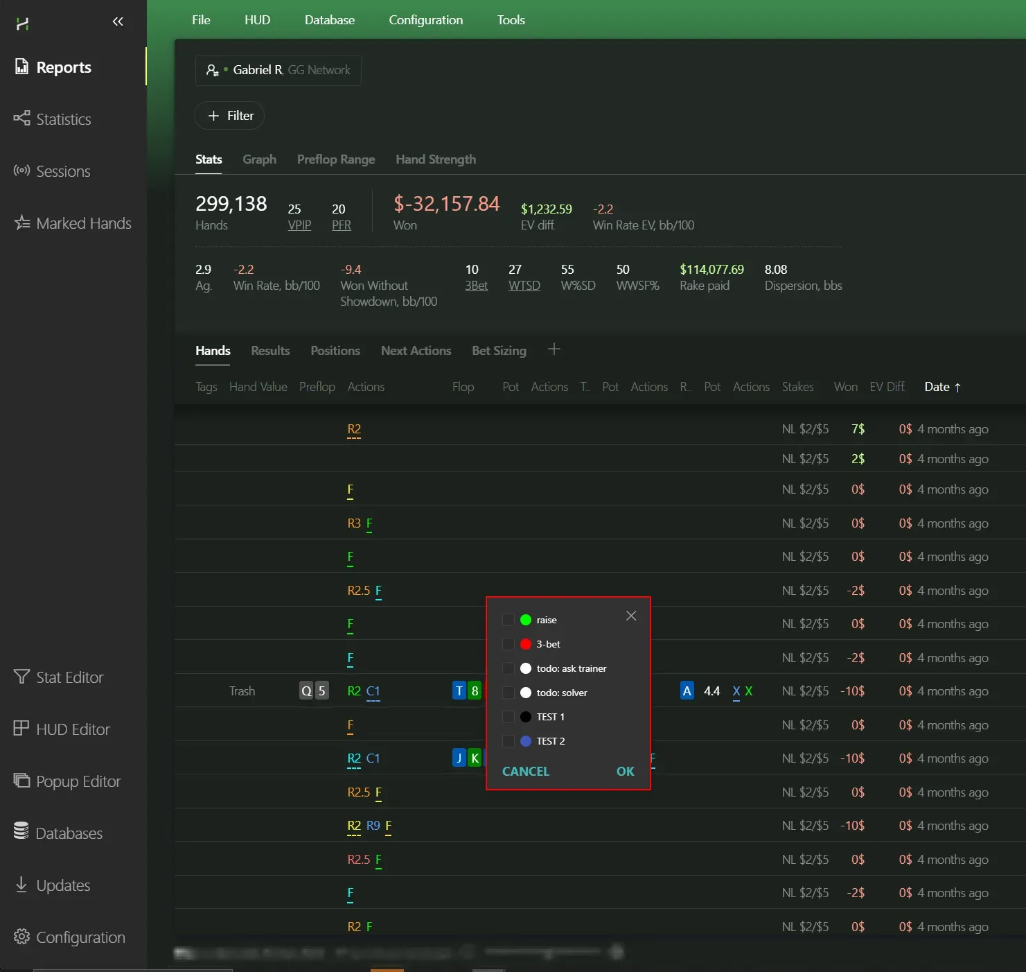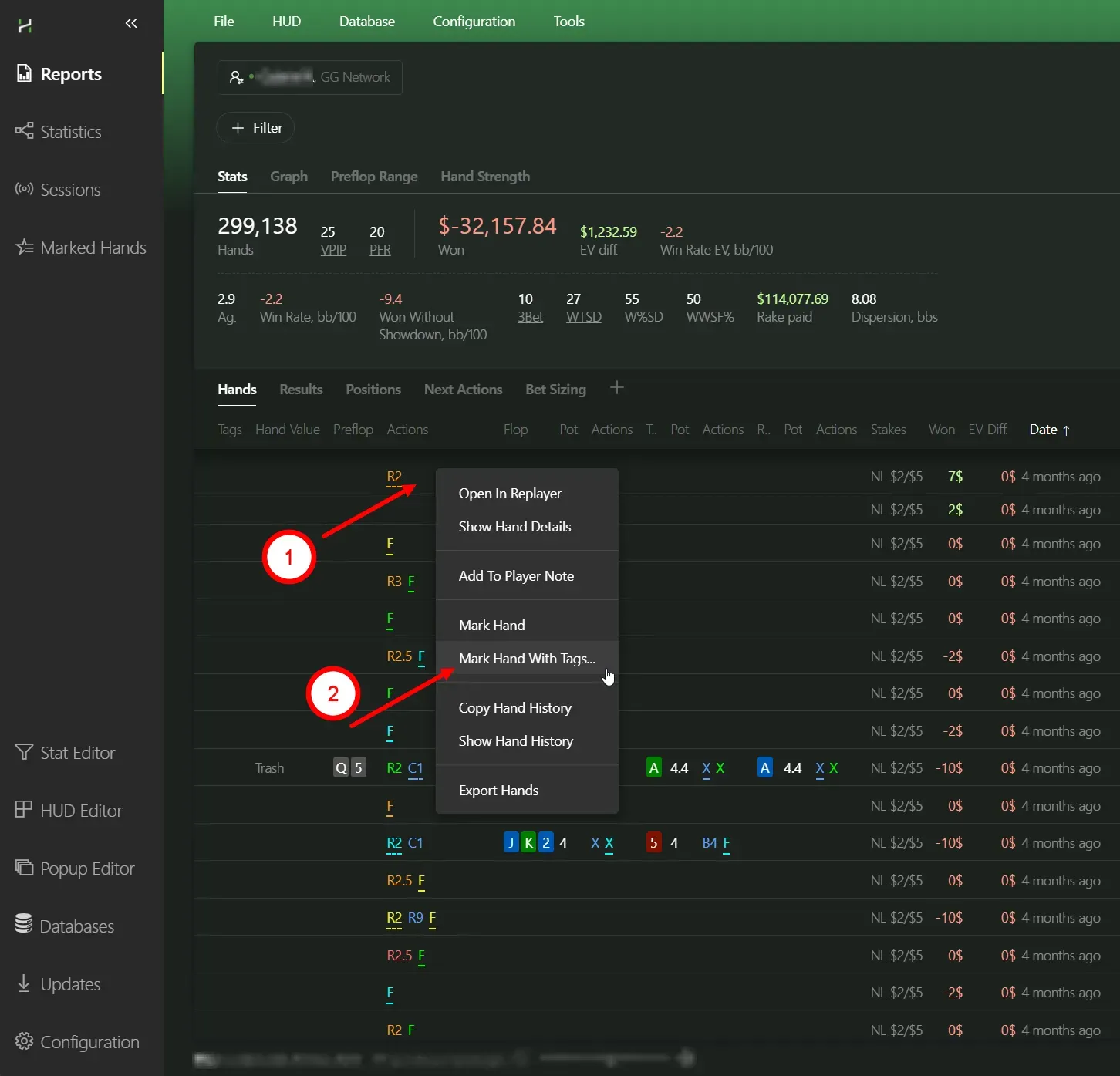 Now you can do more than just mark hands - you can also create tag templates and mark a hand with a specific tag, which makes searching and reviewing saved hands much easier In addition, Hand2Note 4 introduced a wide range of filtering options for tagged hands - something that was badly missing in Hand2Note 3.0, where hands could only be filtered by time. You can tag a hand using these templates anywhere: