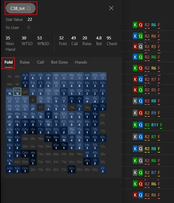 Example in the picture: the Call vs 3Bet stat - matrix with folds.