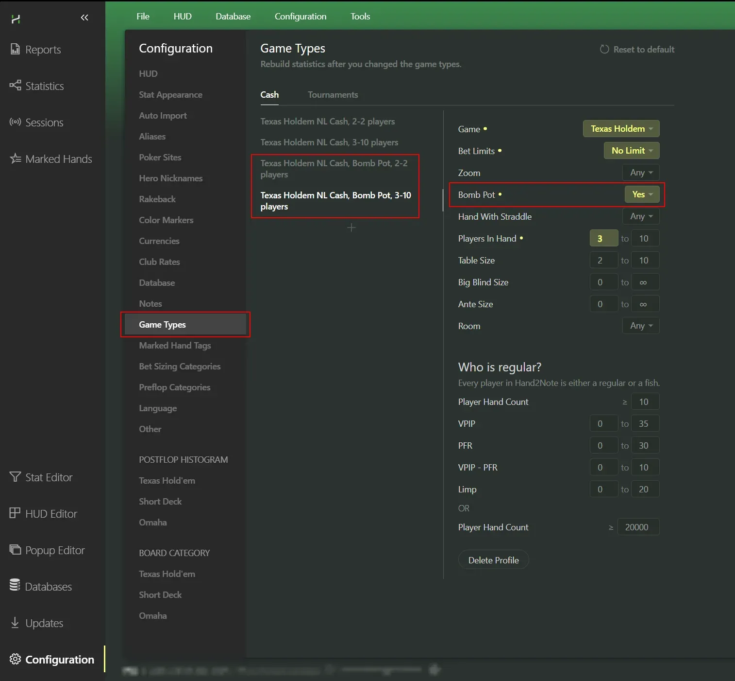 In Hand2Note 4, full support for Bomb Pots has been added. You can now set up a separate game type specifically for Bomb Pots and assign a different HUD or Popup to it. This gives you flexibility: