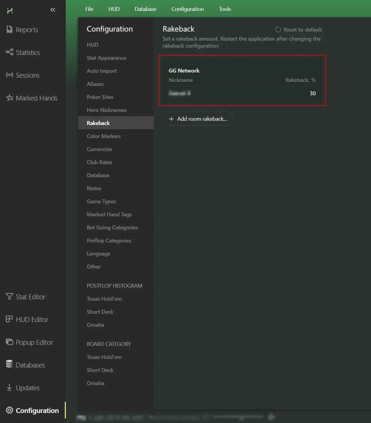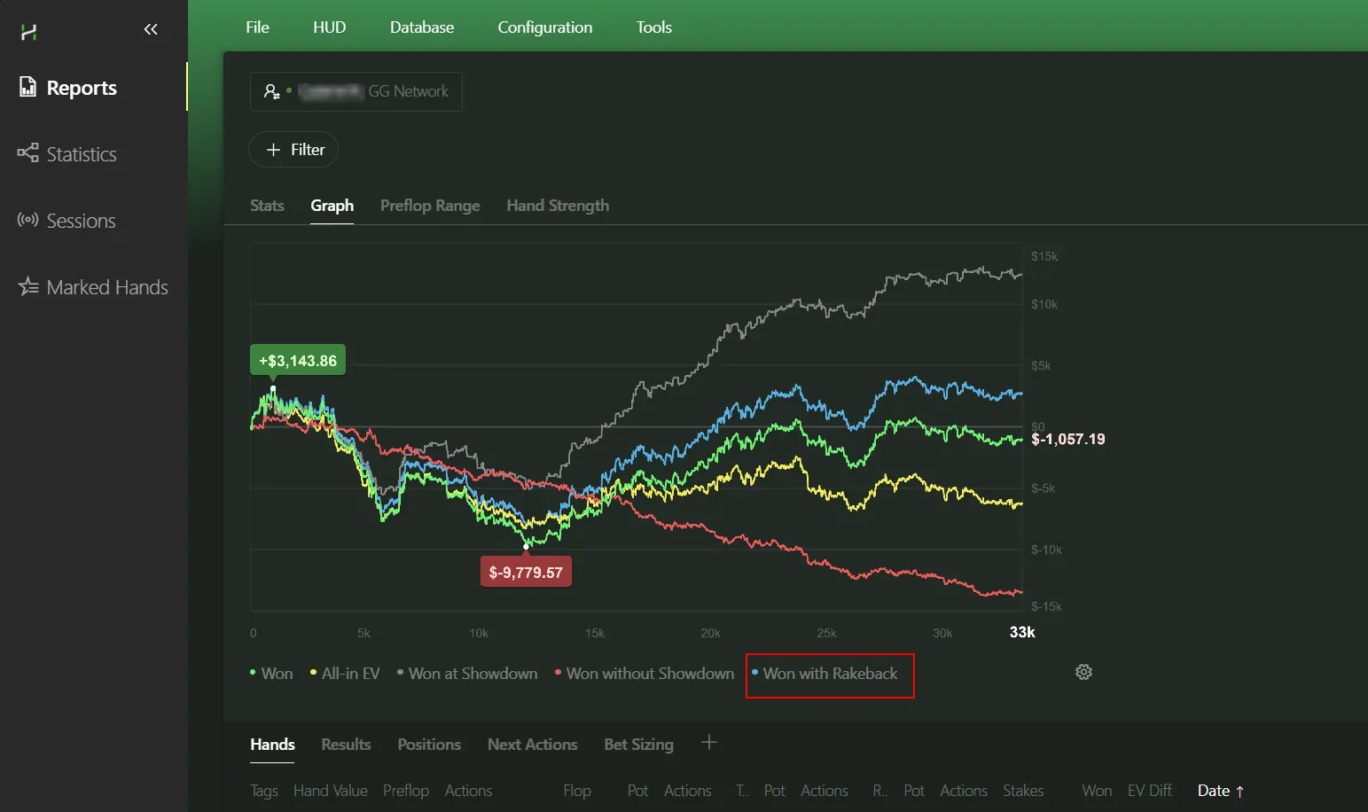 In Hand2Note 4.1 you can specify your poker room and your rakeback percentage, and then your graphs will display your profit including rakeback.