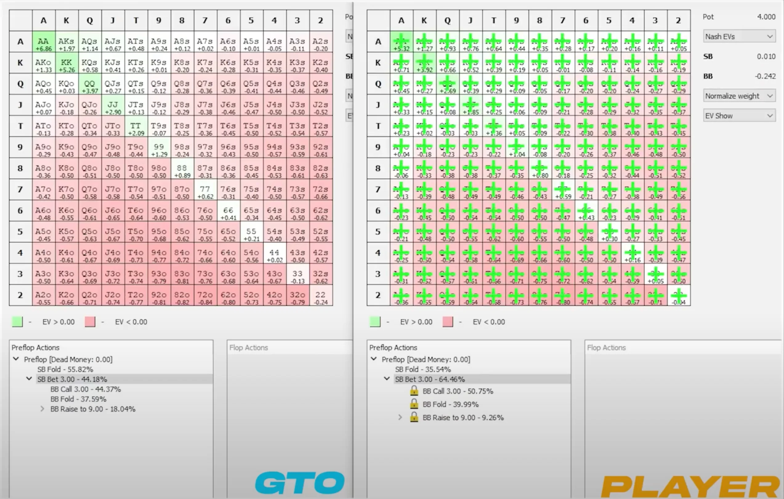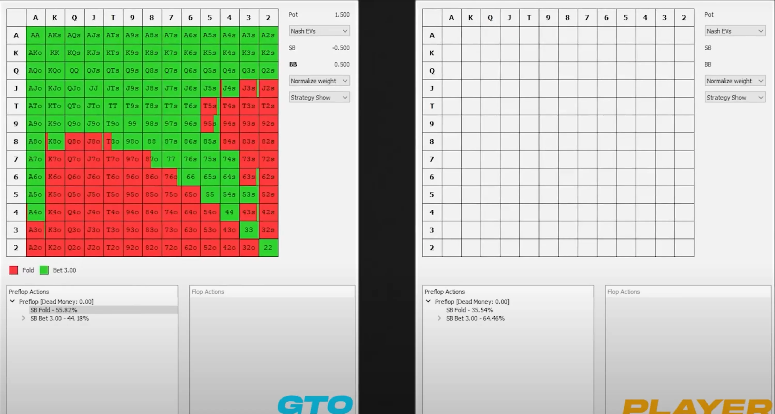 Take a look at these two preflop simulations: on the left, you have the GTO simulation for the small blind versus big blind scenario. The small blind is supposed to open 44% of hands and face a 3x open, while the big blind should respond with 44% calls and 18% 3-bets. On the right, however, you have a simulated player on the big blind that doesn't meet these frequencies: he calls 40% instead of 44% and 3-bets only 9% instead of 18%.