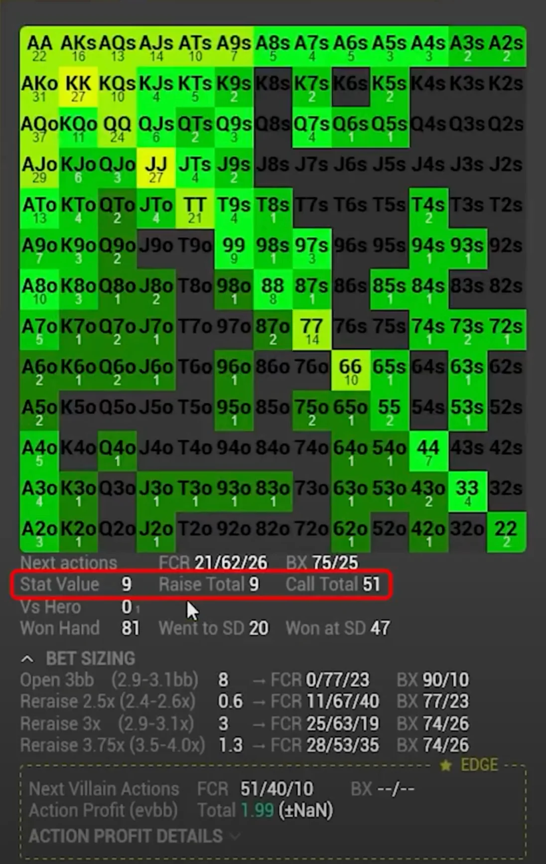 But what about the raise EV? How much money do you win or lose when you face a 3-bet? Well, of course, the answer depends on your exact hand. If you face a 3-bet after opening with aces, for example, your EV shoots up to 32.2 big blinds per hand. That's a lot of money.