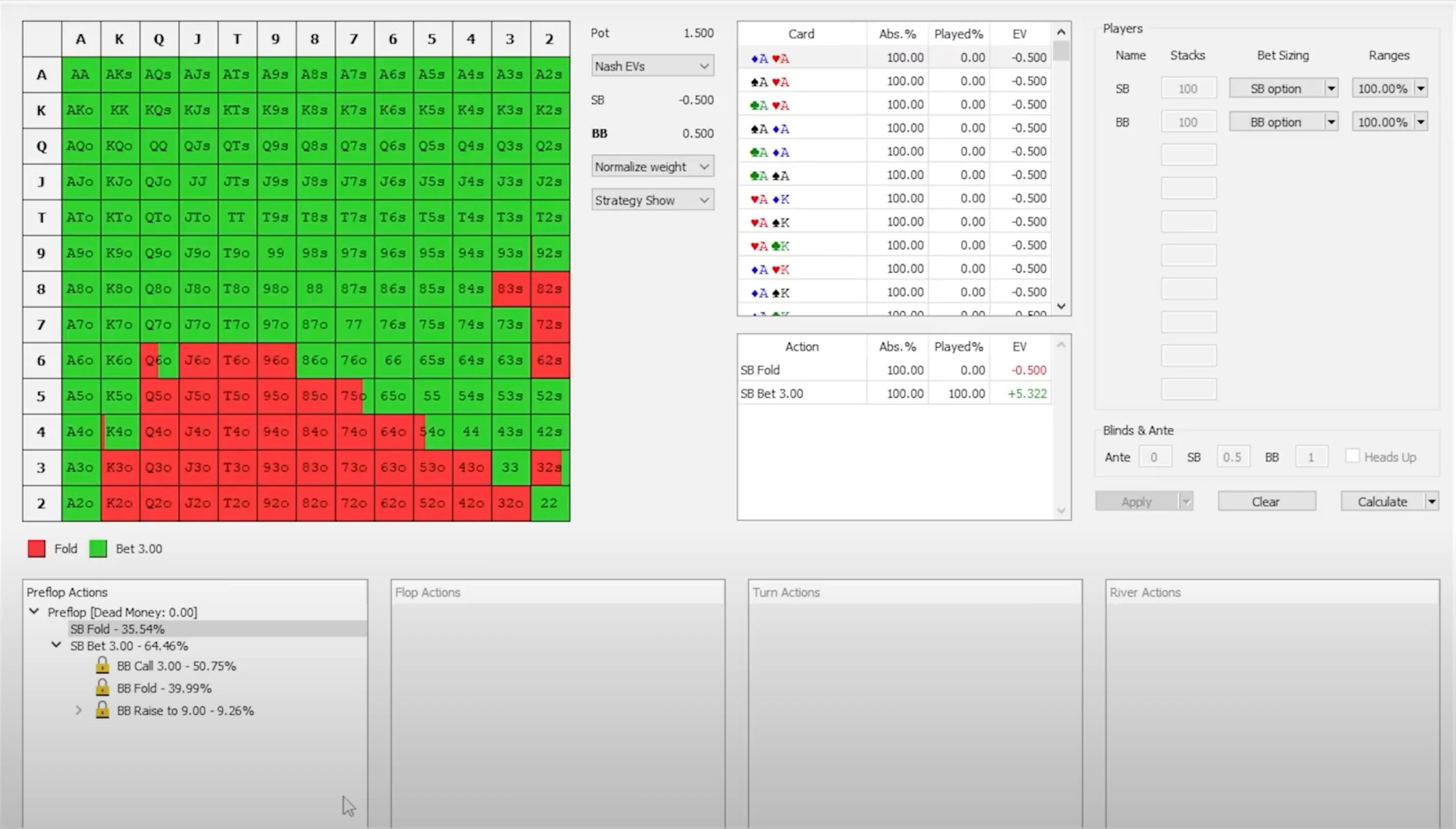 The expected value (EV) of opening from the small blind with a random hand is equal to the sum of the EV of all these three possible outcomes multiplied by their probability. The EV of raising equals the fold EV multiplied by the fold frequency + the call EV multiplied by the call frequency + the raise EV multiplied by the raise frequency.