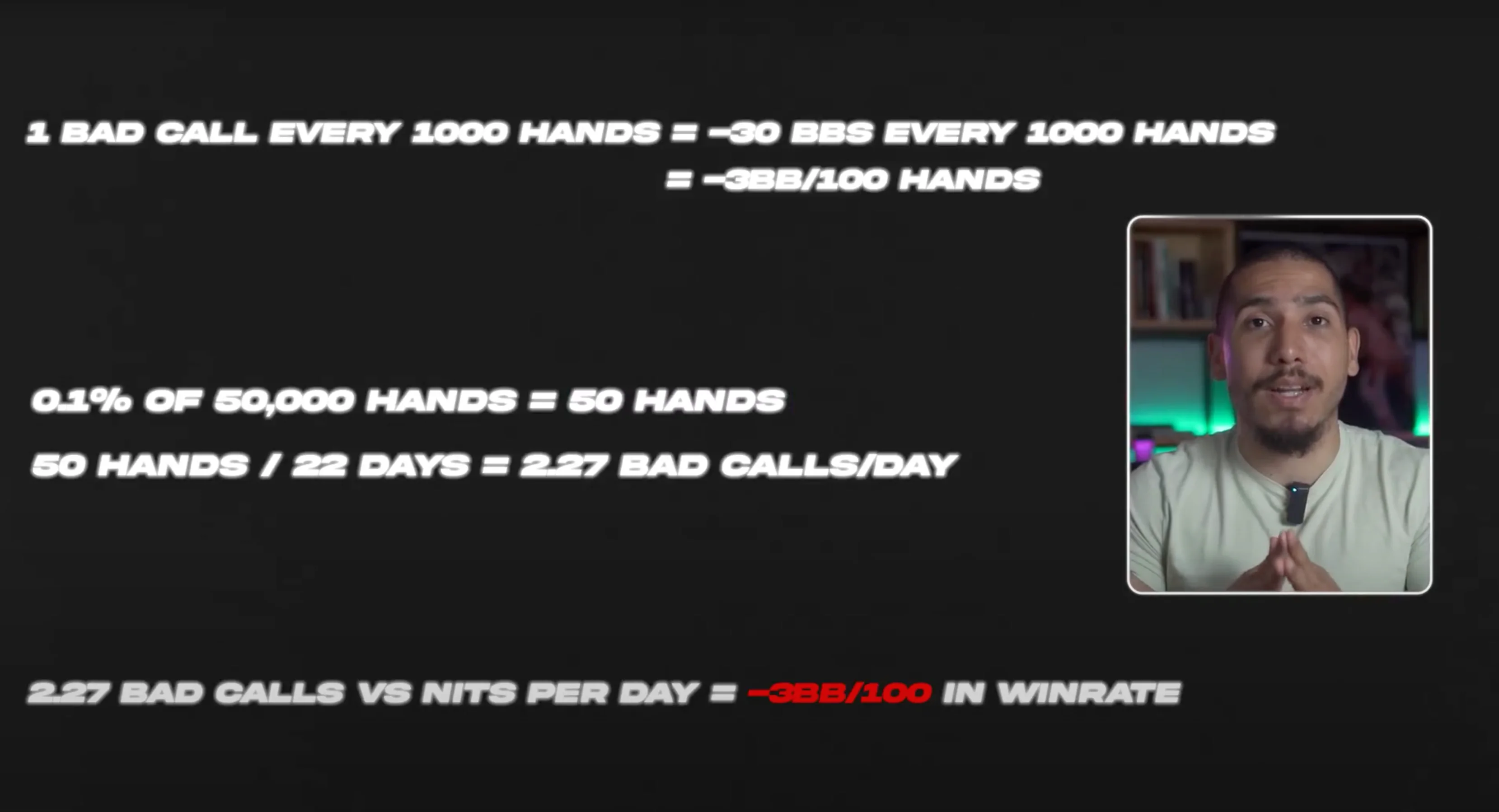 If you make such a call once every 1,000 hands, then the impact on your win rate is three big blinds per 100 hands. You only make the losing call 0.1% of the time. Over a 50,000 hand stretch, perhaps the volume you play in 22 days of grinding, you're only going to be making a bad call in 50 hands. That's basically two bad calls per day. You make two bad losing calls against nits per day, and your win rate drops by three big blinds per 100.