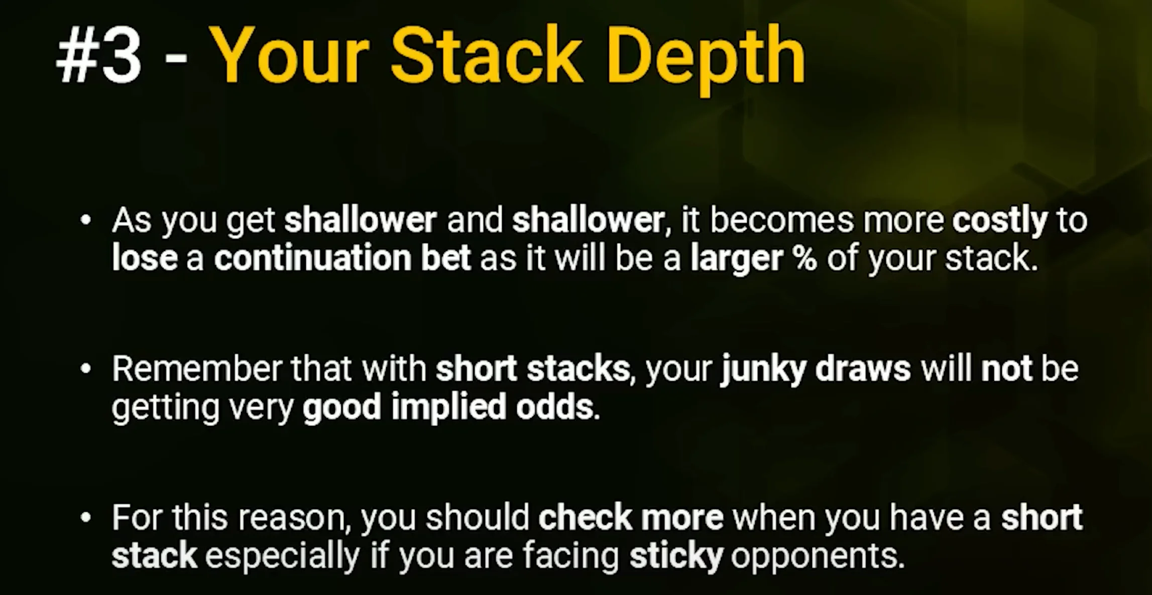 Next, the stack depth, the effective stack depth is very important, not just your stack, but also the stack of everyone involved in the pot. As the stacks get shallower and shallower, it becomes more costly to lose a continuation bet because it will become a larger percentage of your stack.