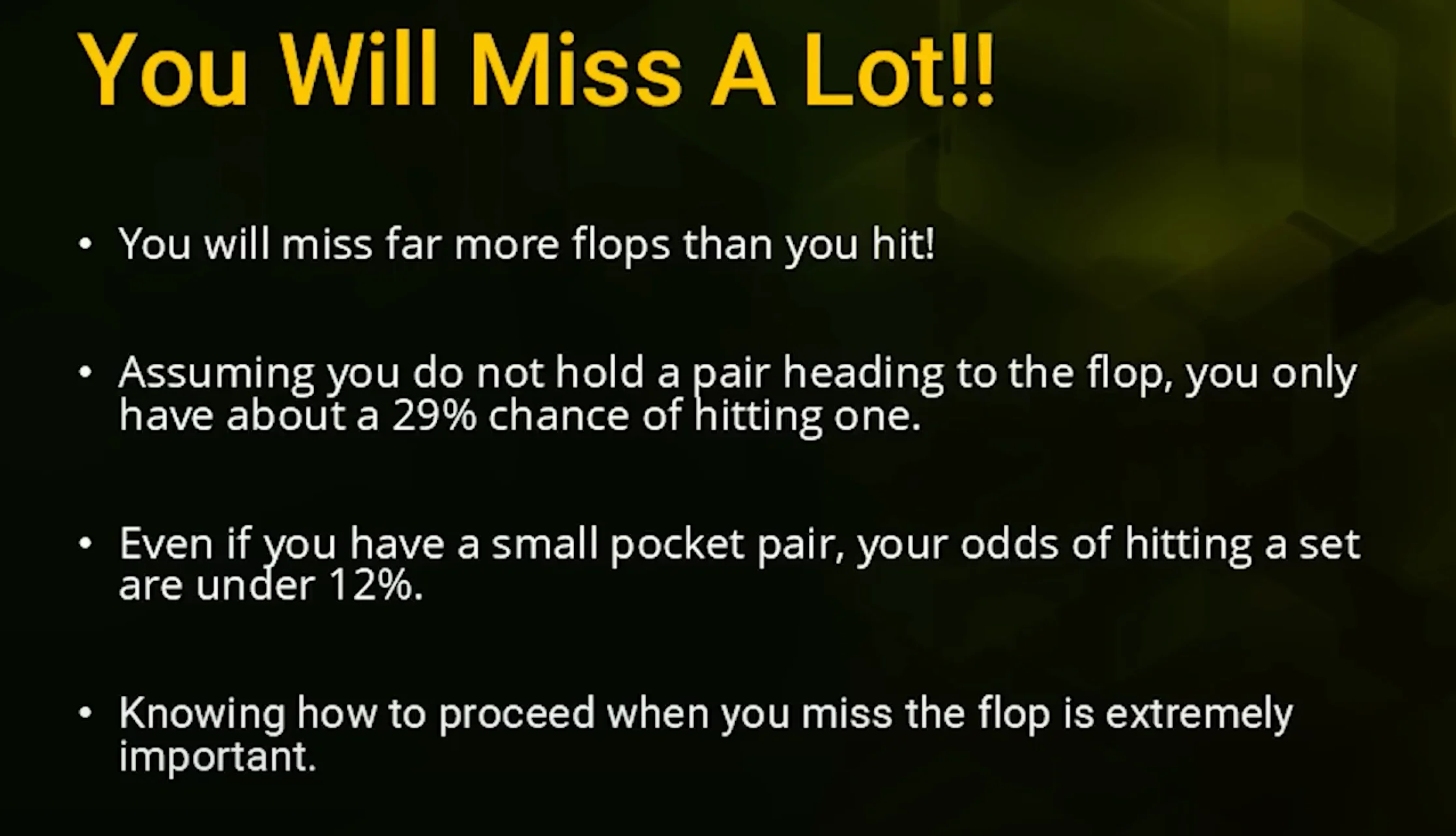 Even if you have a pair in your hand, the odds of flopping a set, three of a kind, are pretty low. Less than 12%.