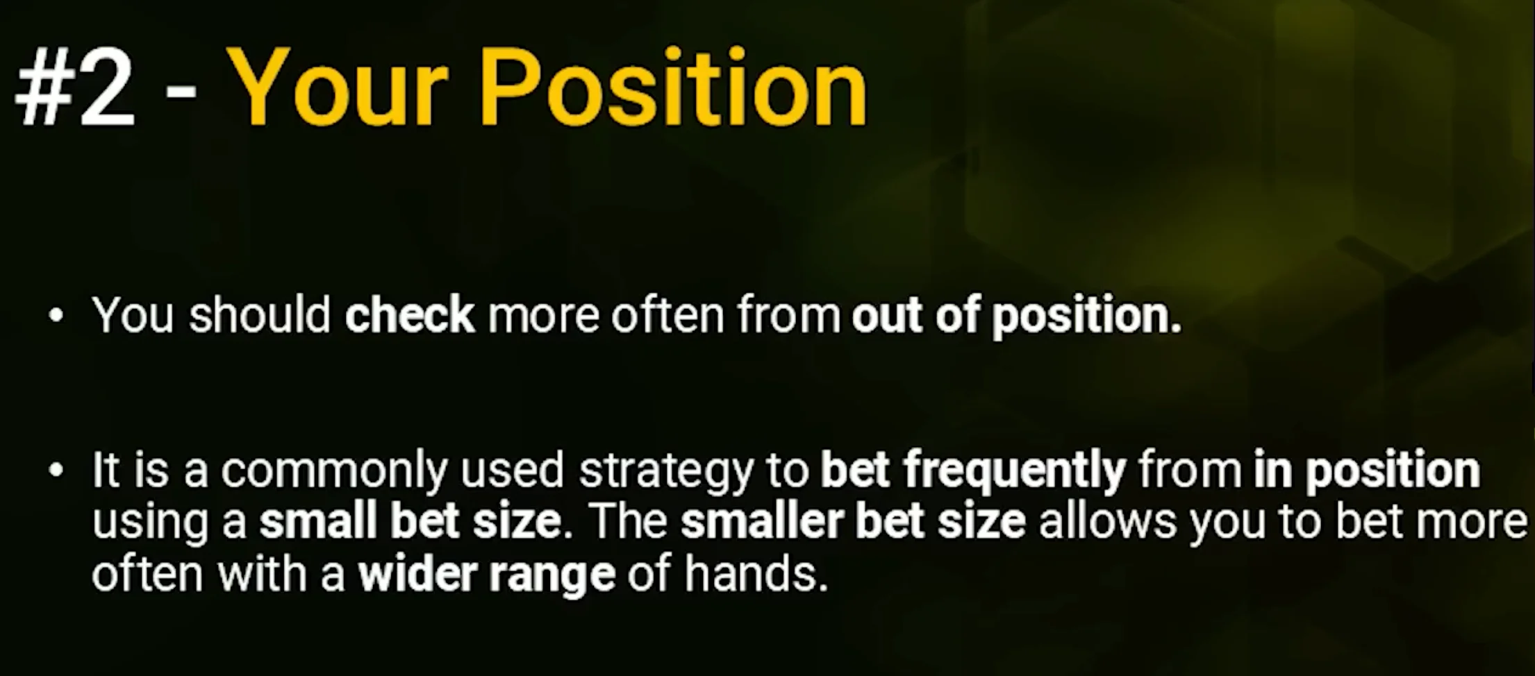 Remember that your strategy needs to change depending on if you are In Position / IP (act AFTER your opponents) or Out Of Position / OP (act BEFORE your opponents), as different ranges will be at play & will connect with different boards, even when your exact hole cards miss the flop.