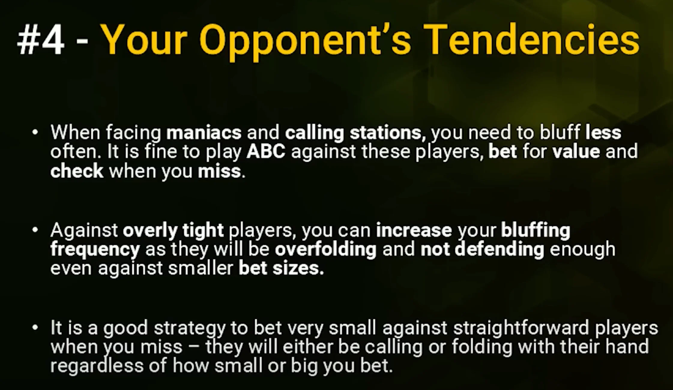 Next, your opponent's tendencies are very important. We've touched on this already a little bit, but in general, when you are facing maniacs or calling stations, essentially people that don't like to fold, you should bluff way less often. It is fine to play ABC, straightforward poker against these players. When you have a good hand, bet for value because they don't like to fold. And when you miss, when you have nothing, just check and give up and lose a tiny pot.