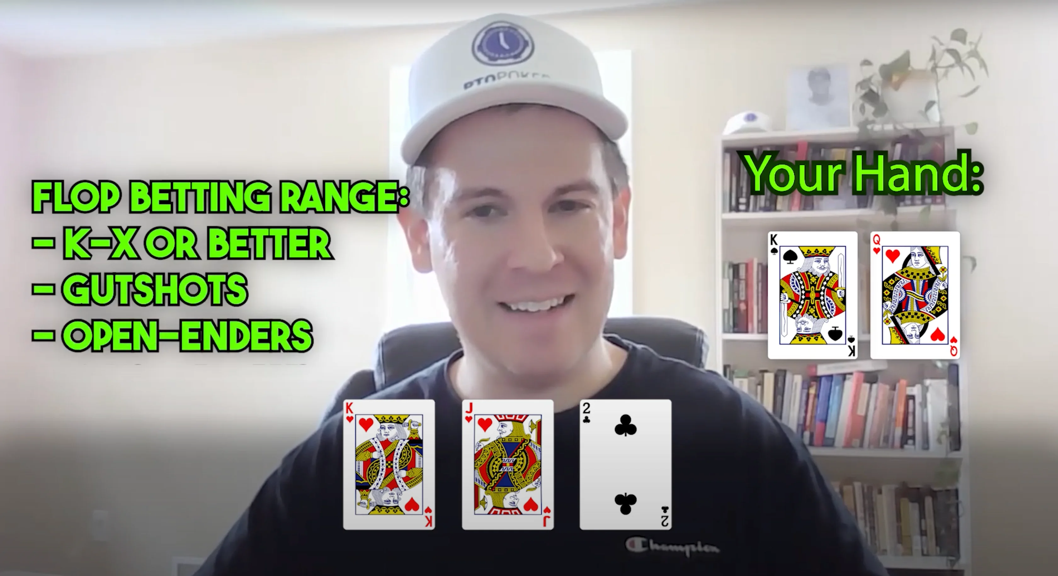 It looks like the suited broadway hands, ace king, ace queen, and a few wheel suited aces. And let's say you're in the big blind with a hand like king of spades, queen of hearts, you decide to defend. Let's say we get a board, and it comes like king of hearts, jack of hearts, deuce of clubs.