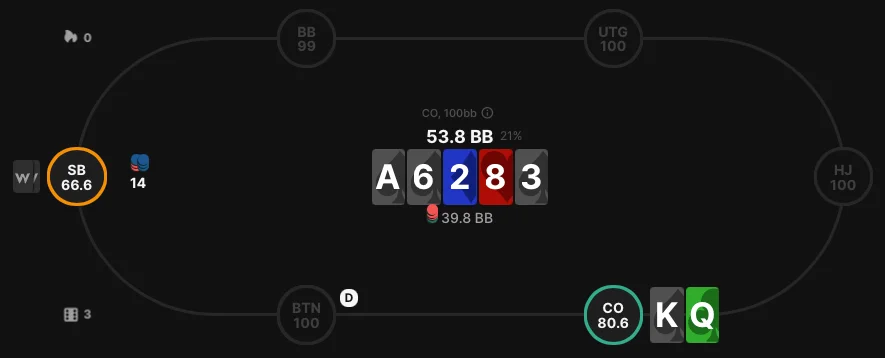 Imagine you hold in the CO. On the river, your opponent bets 14bb (35% pot size). In this case, considering blockers makes a bluff more viable.