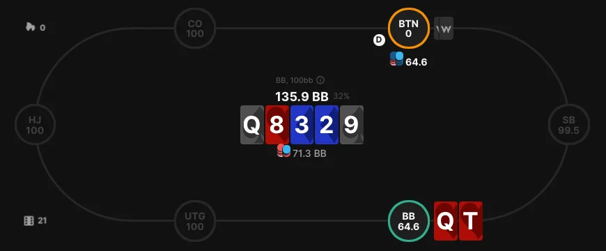 Imagine you hold in the BB. Your opponent goes all-in for 64.6 bb (91% pot size) on the board: