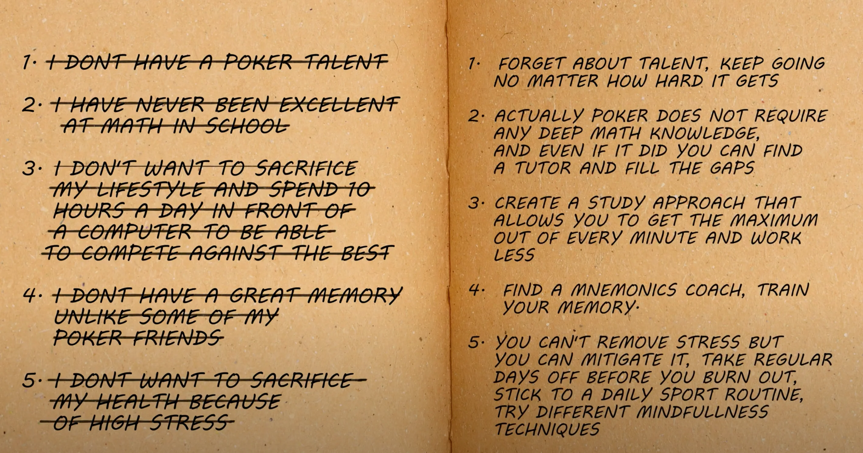Take a pen and a piece of paper, divide it into two vertical columns, and on the left side, make a list of reasons why, in your opinion, you cannot become a mid or high stakes crusher.