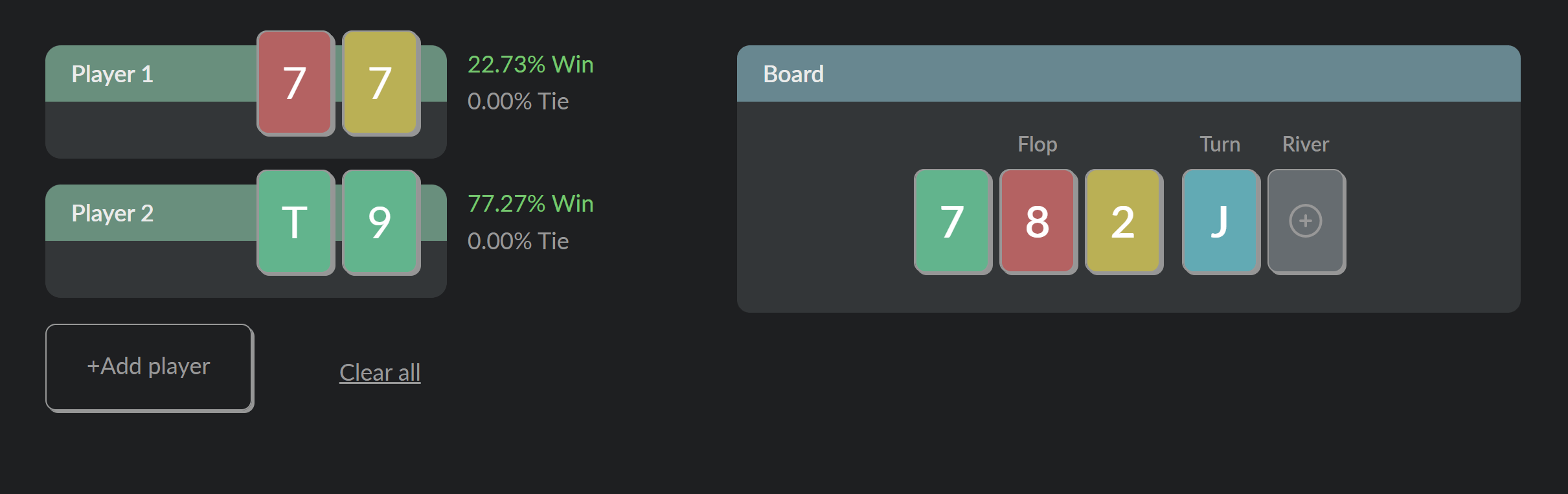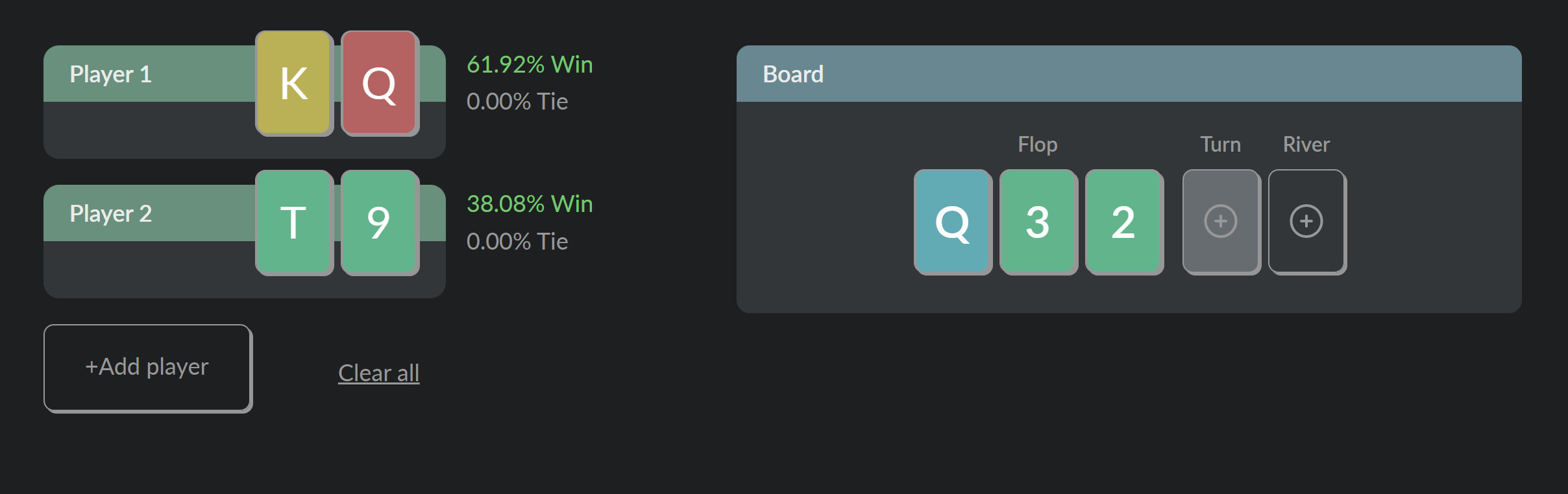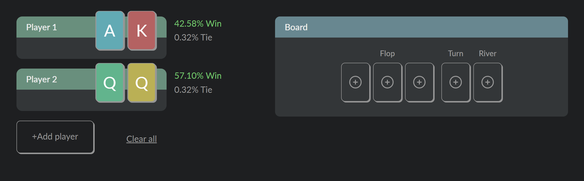 To use the calculator, set a hole cards of the players and you'll immediately see their chances to win the hand. You can add more players (up to 10) and set community cards (Flop, Turn, and River). So you can calculate the odds of winning for any hand on any street from Pre-Flop to River. Our calculator will show you the winning chances for every hand depending on the parameters you set.