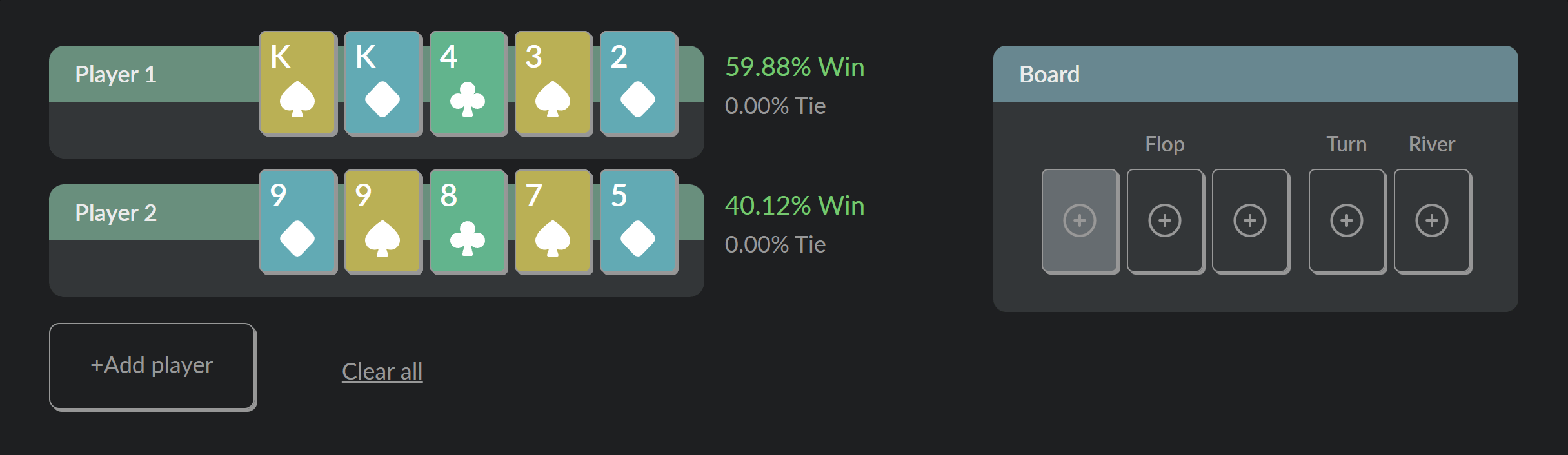 The calculator shows the winning odds (equity) for each hand at any point in the game. Simply input the required information, and it will calculate the equity for all players.